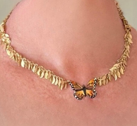 Embark on a journey of craftsmanship with our meticulously crafted kiln-fired monarch pendant nestled within a bed of intricate gold leaves on the necklace. Subjected to the precision of a 1450-degree kiln for two minutes, this delicate piece is a testament to artisanal mastery. Each detail of the monarch is hand-painted with liquid enamel watercolor, enhancing its beauty and uniqueness. This pendant is not just an accessory; it's a special and carefully crafted piece that reflects the dedication to craftsmanship and the artistry of nature.