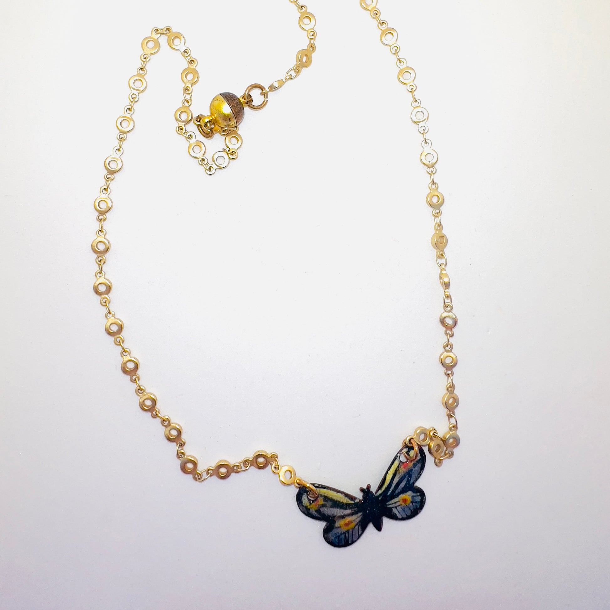 A gold small link chain showcases a hand-painted enamel monarch butterfly, blending luxury with the intricate beauty of nature.