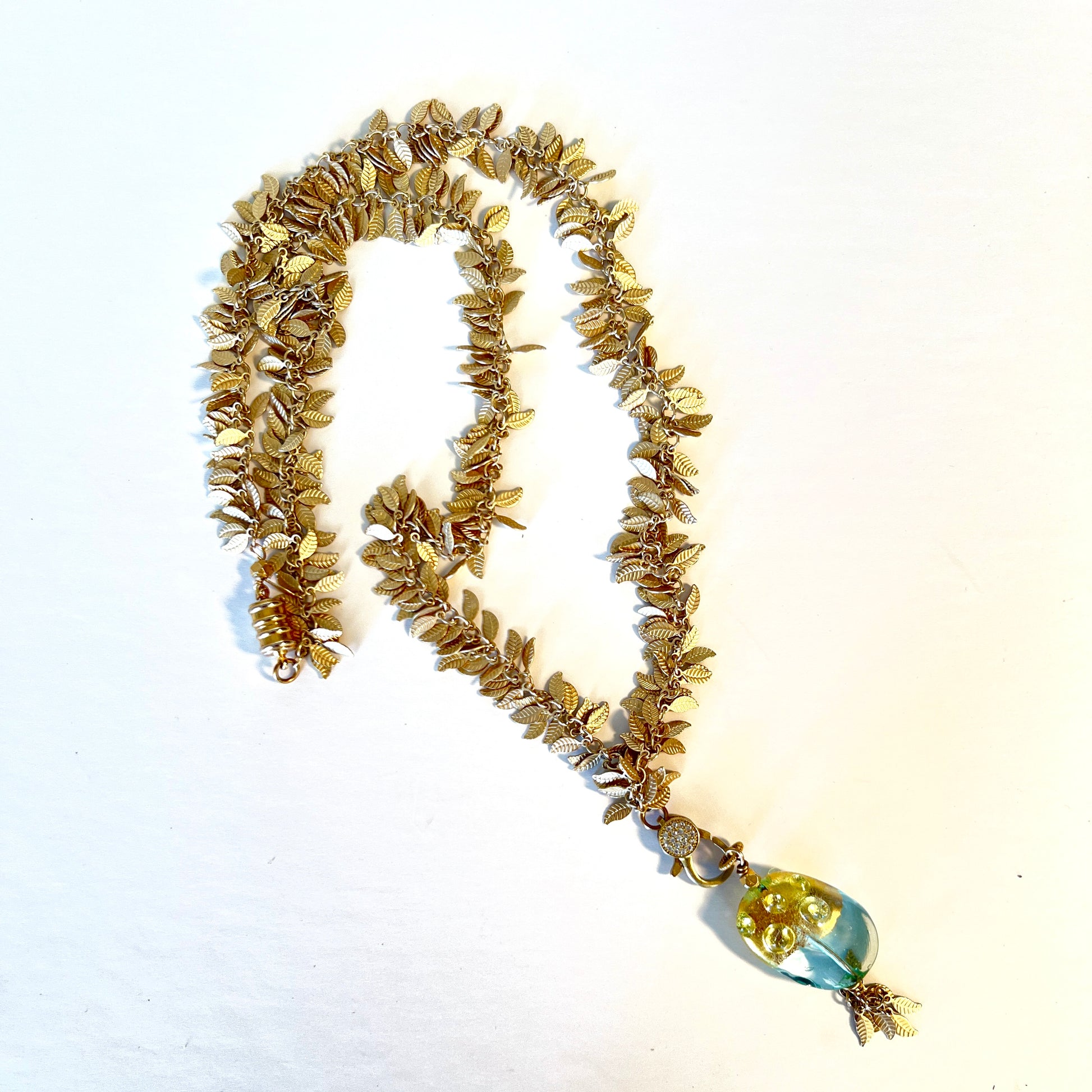 Introducing Murano's exquisite creation, ""The Dewdrop."" Crafted from translucent powder blue glass with a textured gold cap, this piece is truly extraordinary. It holds sentimental value as my latest acquisition. To elevate its charm, I adorned it with charming leaf dangles sourced from my signature gold leaf necklace, resulting in a delicate yet playful aesthetic. The pendant measures 1 1/2 inches and seamlessly attaches to any necklace with its pave lobster clasp.